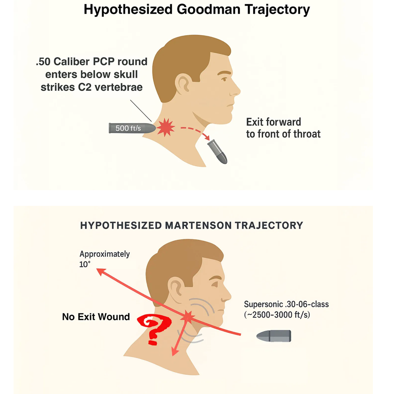 While many have considered the need for two shots to pull off this baffling assassination, Jason Goodman, professional videographer turned investigative journalist and digital sleuth extraordinaire, has painstakingly unearthed evidence of the kill shot coming from behind Kirk. According to this theory, which I find very plausible, someone, whether Tyler Robinson from a rooftop 200 yards away, or someone else in another location, fired the shot we all heard—but it was not the kill shot. The fatal shot was not supersonic but subsonic, possibly via a silencer, or as Goodman suggests, it was a low-muzzle velocity projectile, likely a .50 caliber PCP round shot from an air-rifle and possibly digitally synced with the supersonic rifle shot fired further away that functioned as a decoy to fit the cover story.