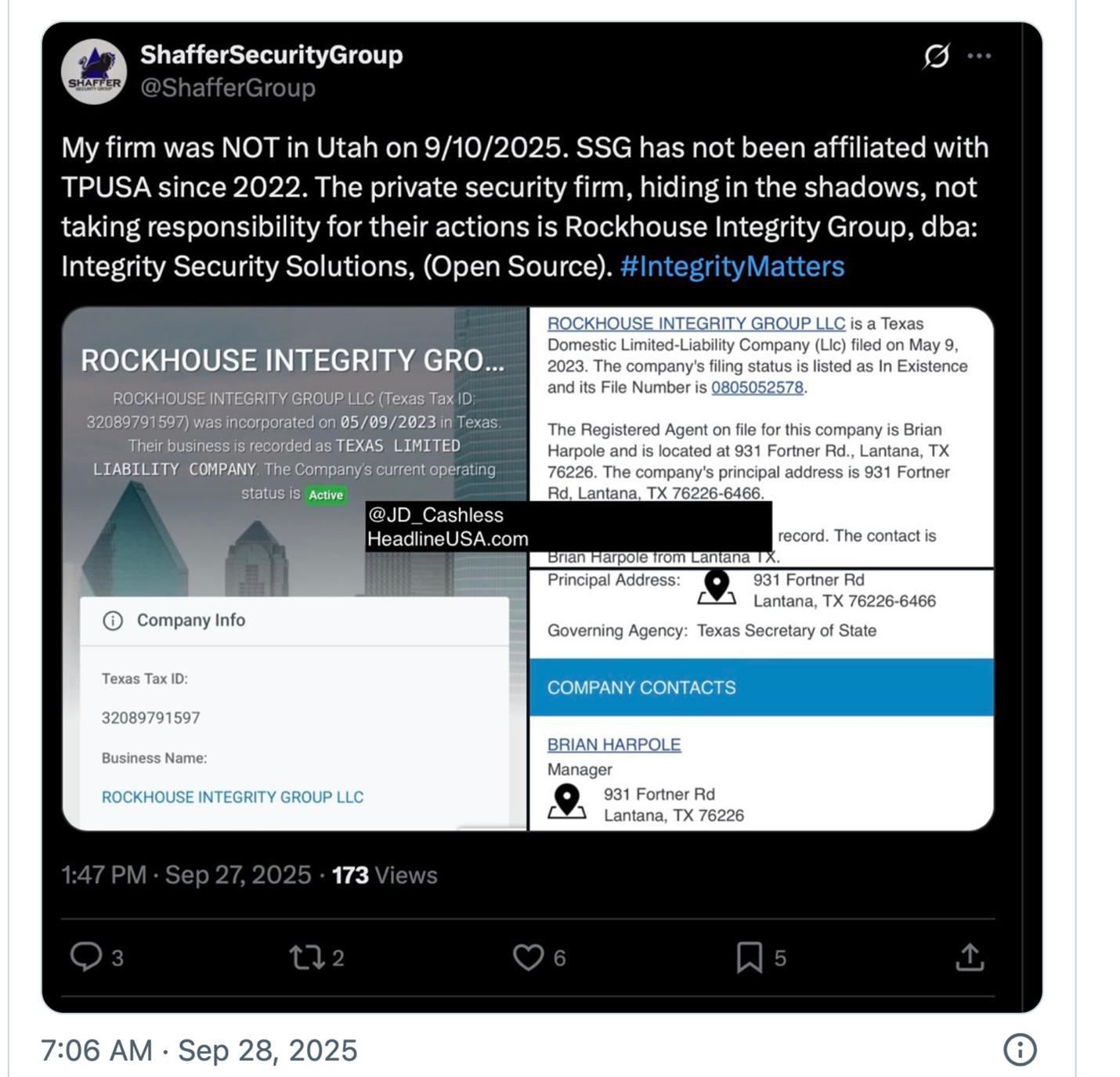Another point of interest: TPUSA’s security head, Dan Flood, the man wearing black who appeared to give an arm signal just prior to the shot, and who is Brian Harpole’s associate in his security company Rockhouse Integrity Group—was also present, along with Harpole, at the rally in Butler, Pennsylvania where Trump narrowly escaped an assassin’s bullet. They were there to provide security for Charlie Kirk at the Trump rally.